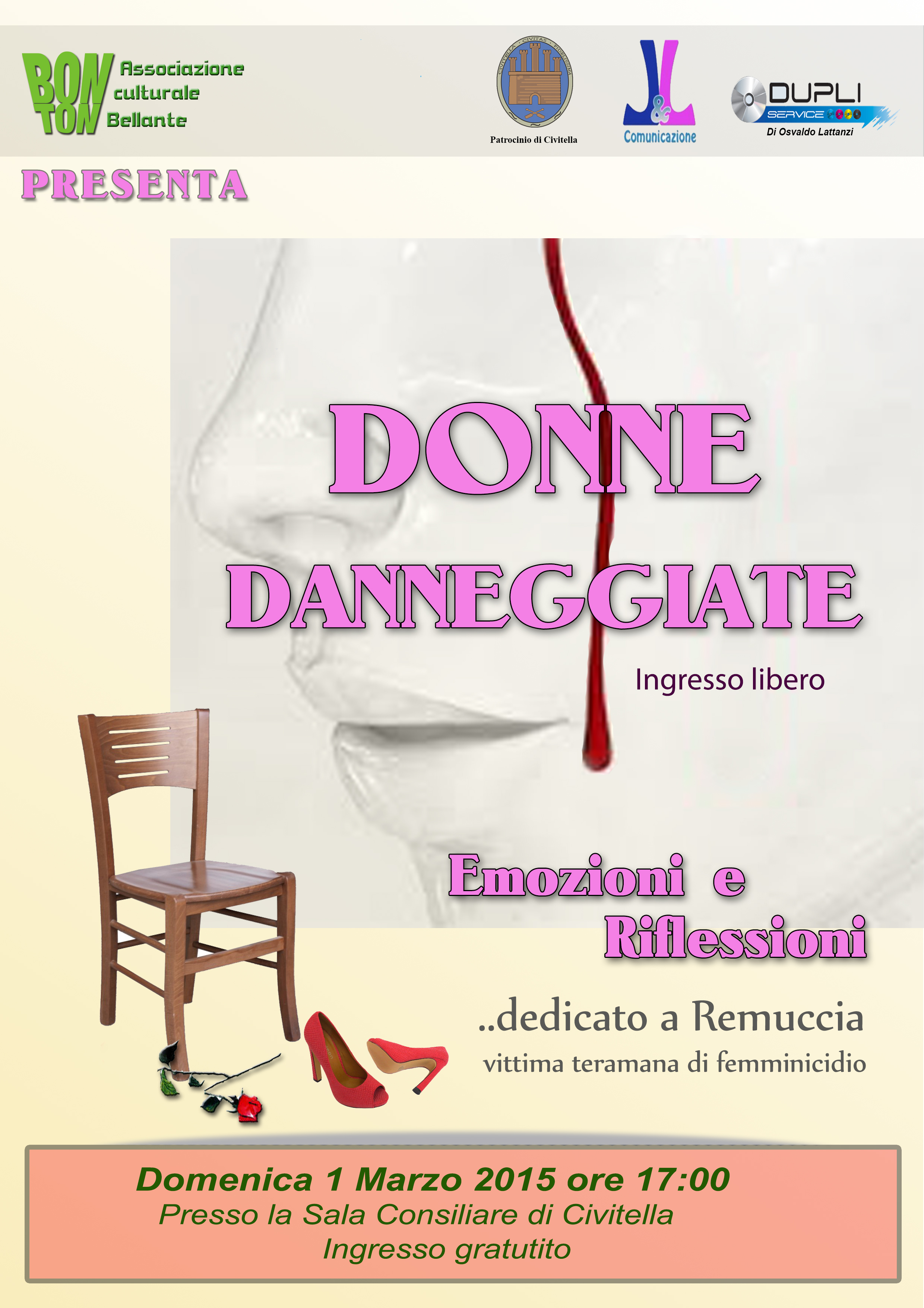 Il Sindaco Avv. Cristina Di Pietro e l'Assessore alla Cultura Barbara D'Alessio invitano la cittadinanza tutta a partecipare allo spettacolo artistico musicale "Donne danneggiate", emozioni e riflessioni sul tema della violenza sulle donne, che si terrà domenica 1° marzo 2015 alle ore 17:00 presso la Sala Consiliare "Stefano Di Bonaventura" di Civitella del Tronto.